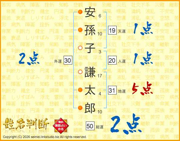 安(6画)孫(10画)子(3画) 謙(17画)太(4画)郎(10画)