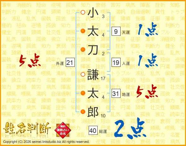 小(3画)太(4画)刀(2画) 謙(17画)太(4画)郎(10画)