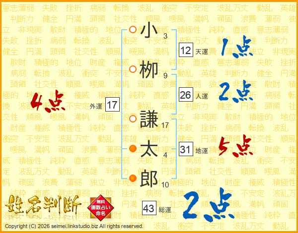小(3画)栁(9画) 謙(17画)太(4画)郎(10画)