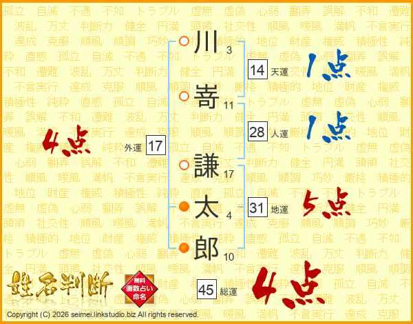 川(3画)嵜(11画) 謙(17画)太(4画)郎(10画)
