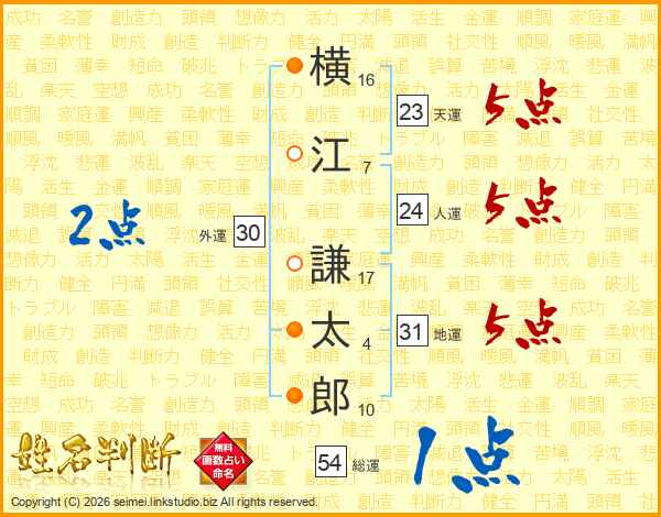 横(16画)江(7画) 謙(17画)太(4画)郎(10画)