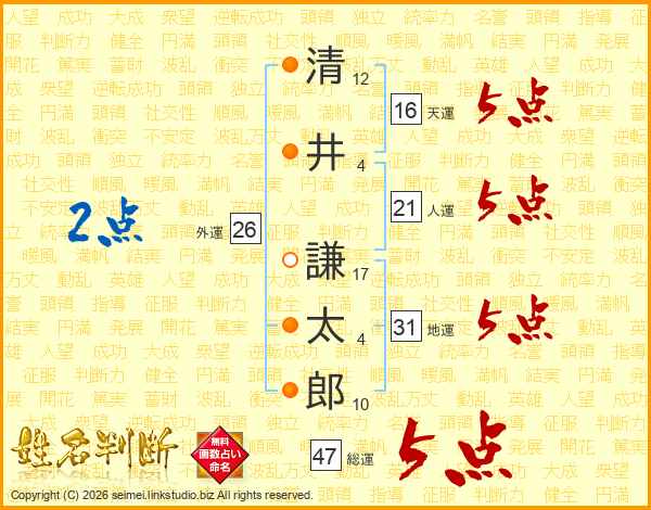 清井謙太郎さんの総運は47画の5点!