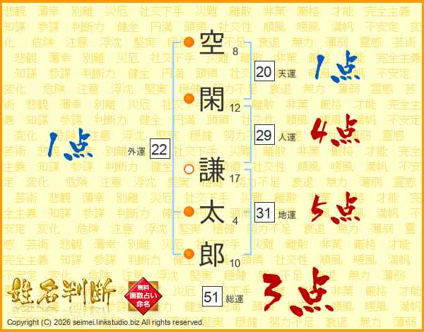 空(8画)閑(12画) 謙(17画)太(4画)郎(10画)