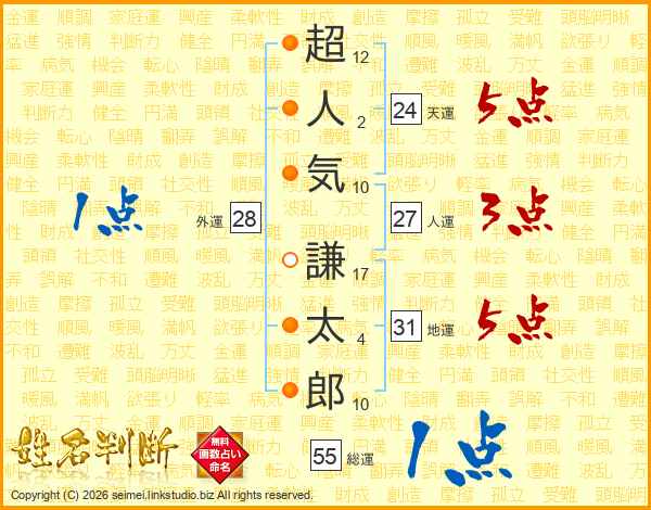 超(12画)人(2画)気(10画) 謙(17画)太(4画)郎(10画)