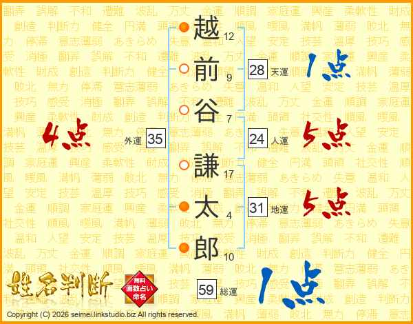 越(12画)前(9画)谷(7画) 謙(17画)太(4画)郎(10画)