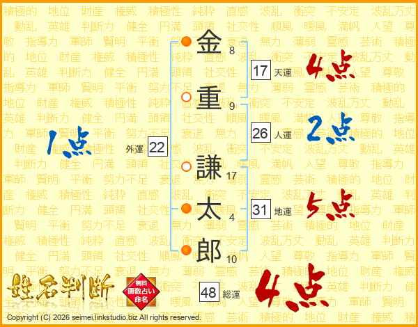 金(8画)重(9画) 謙(17画)太(4画)郎(10画)