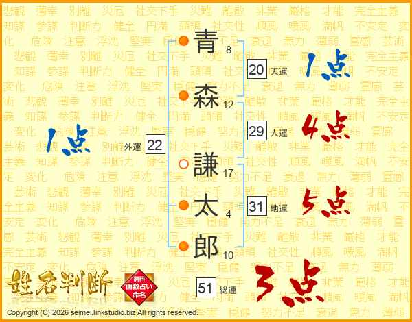 青(8画)森(12画) 謙(17画)太(4画)郎(10画)
