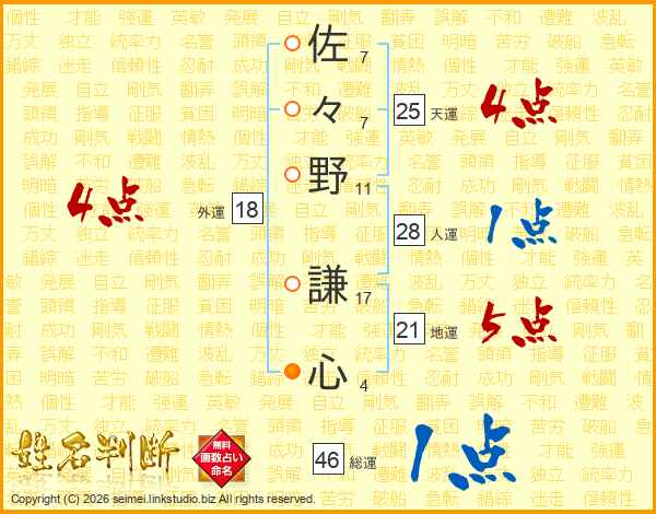 佐々野謙心さんの天運は25画の4点!