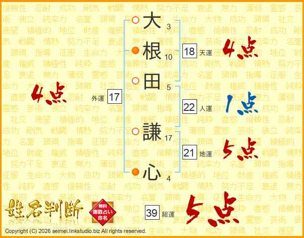 大(3画)根(10画)田(5画) 謙(17画)心(4画)