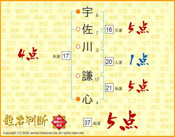 宇(6画)佐(7画)川(3画) 謙(17画)心(4画)