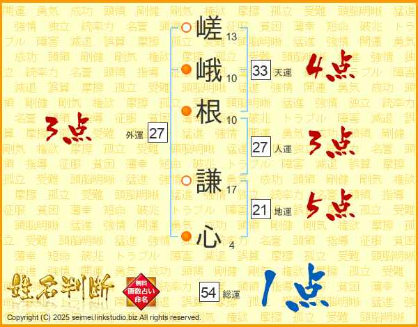嵯(13画)峨(10画)根(10画) 謙(17画)心(4画)