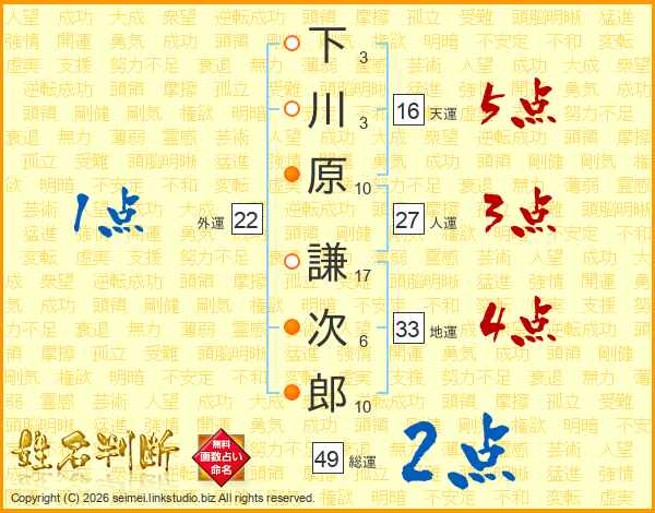 下川原謙次郎さんの地運は33画の4点!
