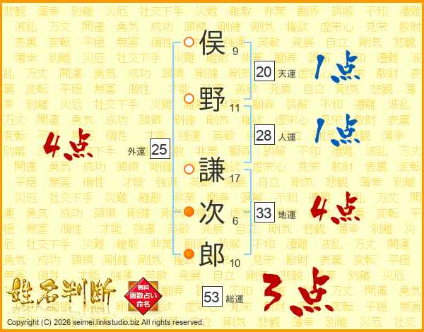 俣(9画)野(11画) 謙(17画)次(6画)郎(10画)