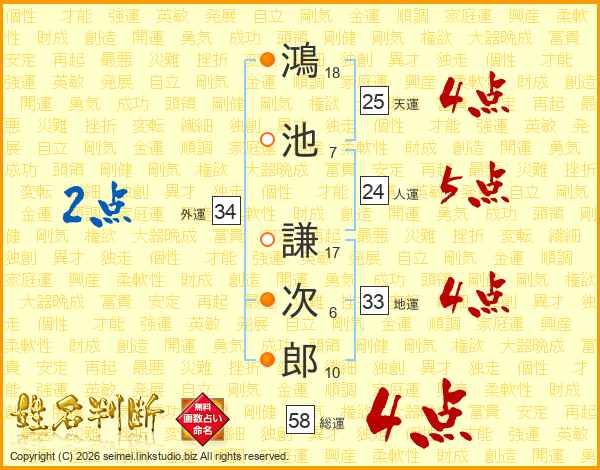 鴻(18画)池(7画) 謙(17画)次(6画)郎(10画)