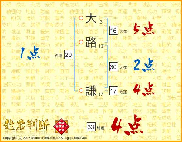 生活面を象徴する運勢です。外部から受ける影響力を表し、結婚運、家庭運や職場、環境への順応性を表します。総運から人運を引いた画数。姓や名が1文字の場合を除く。