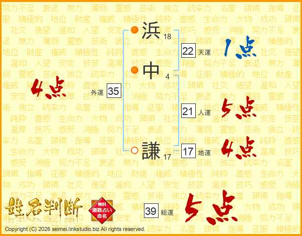 あなたの人生を表す1番重要な運勢です。生涯を通じて影響する総合運となり、主に50歳以降の晩年期に影響を及ぼします。苗字と名前の合計画数。