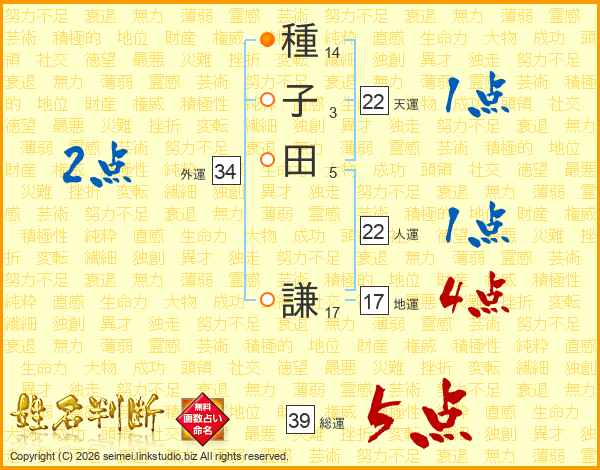 種子田謙さんの総運は39画の5点!