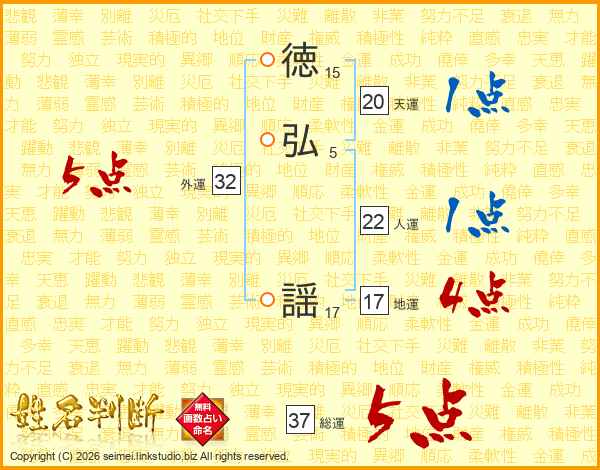 徳弘謡さんの総運は37画の5点!