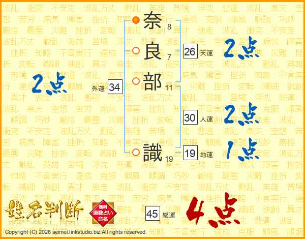 奈良部識さんの総運は45画の4点!