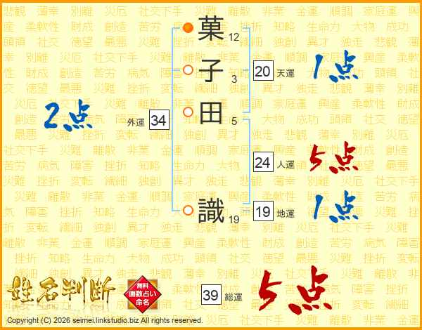 生活面を象徴する運勢です。外部から受ける影響力を表し、結婚運、家庭運や職場、環境への順応性を表します。総運から人運を引いた画数。姓や名が1文字の場合を除く。