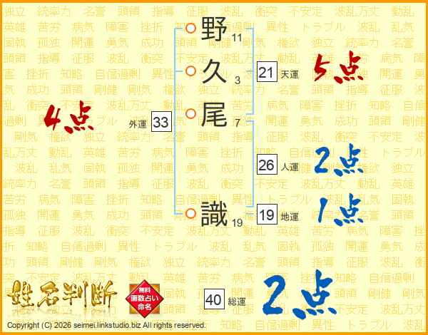 生活面を象徴する運勢です。外部から受ける影響力を表し、結婚運、家庭運や職場、環境への順応性を表します。総運から人運を引いた画数。姓や名が1文字の場合を除く。
