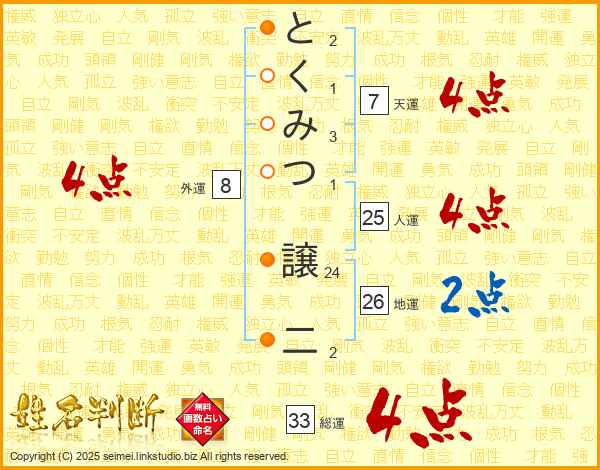生活面を象徴する運勢です。外部から受ける影響力を表し、結婚運、家庭運や職場、環境への順応性を表します。総運から人運を引いた画数。姓や名が1文字の場合を除く。
