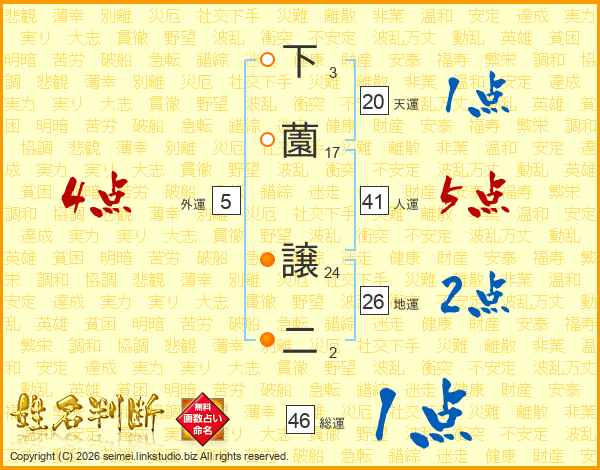 生活面を象徴する運勢です。外部から受ける影響力を表し、結婚運、家庭運や職場、環境への順応性を表します。総運から人運を引いた画数。姓や名が1文字の場合を除く。