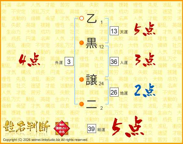 乙(1画)黒(12画) 譲(24画)二(2画)