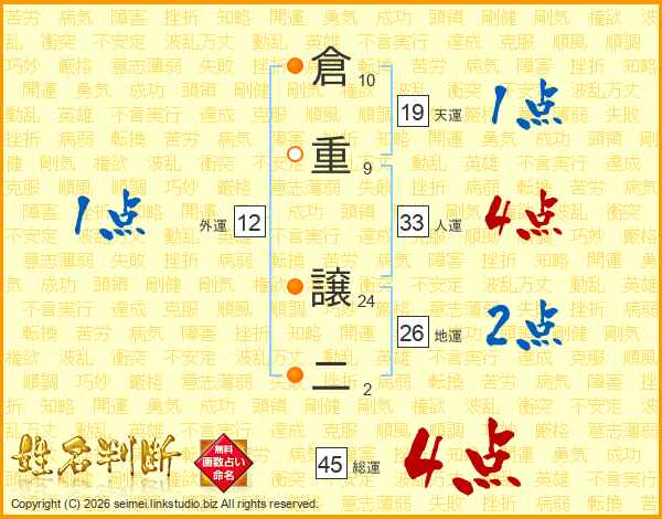 生活面を象徴する運勢です。外部から受ける影響力を表し、結婚運、家庭運や職場、環境への順応性を表します。総運から人運を引いた画数。姓や名が1文字の場合を除く。