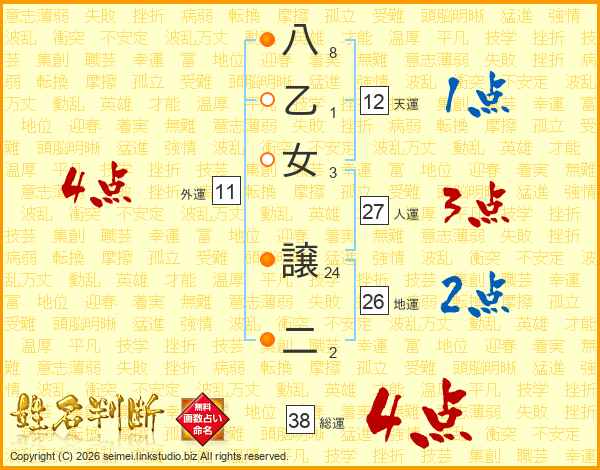 八(8画)乙(1画)女(3画) 譲(24画)二(2画)