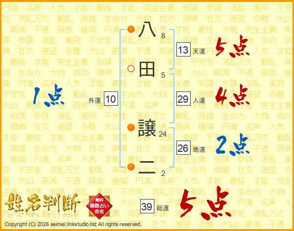 生活面を象徴する運勢です。外部から受ける影響力を表し、結婚運、家庭運や職場、環境への順応性を表します。総運から人運を引いた画数。姓や名が1文字の場合を除く。