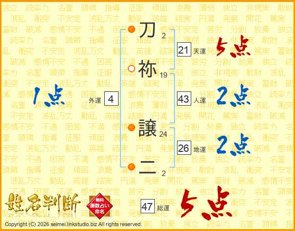 刀祢譲二さんの総運は47画の5点!