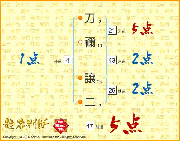 刀禰譲二さんの総運は47画の5点!