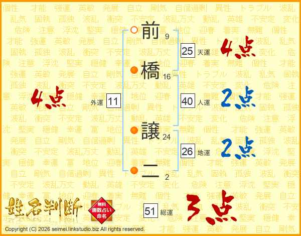 家系が持つ宿命的な運勢を表します。祖先から受け継いだ苗字ですので自分の力が及びません。家柄を象徴します。苗字の合計画数。