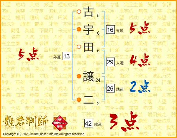 古(5画)宇(6画)田(5画) 譲(24画)二(2画)