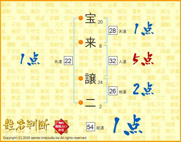 宝(20画)来(8画) 譲(24画)二(2画)