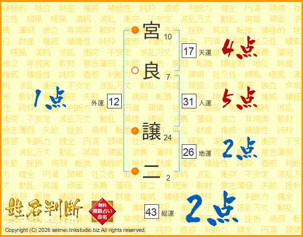 生活面を象徴する運勢です。外部から受ける影響力を表し、結婚運、家庭運や職場、環境への順応性を表します。総運から人運を引いた画数。姓や名が1文字の場合を除く。