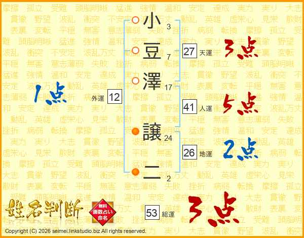 小豆澤譲二さんの総運は53画の3点!