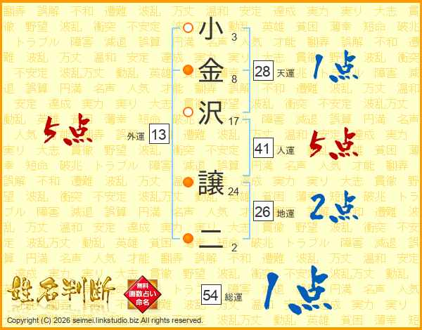 小(3画)金(8画)沢(17画) 譲(24画)二(2画)