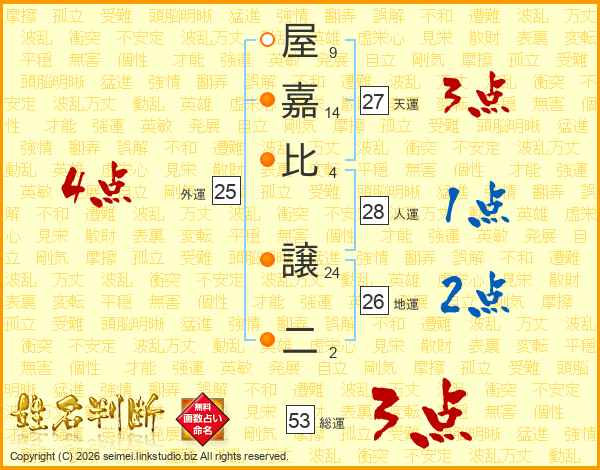 屋(9画)嘉(14画)比(4画) 譲(24画)二(2画)