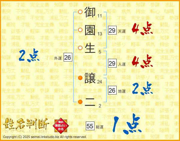 御(11画)園(13画)生(5画) 譲(24画)二(2画)