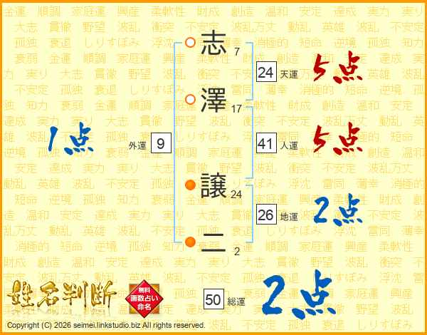 生活面を象徴する運勢です。外部から受ける影響力を表し、結婚運、家庭運や職場、環境への順応性を表します。総運から人運を引いた画数。姓や名が1文字の場合を除く。