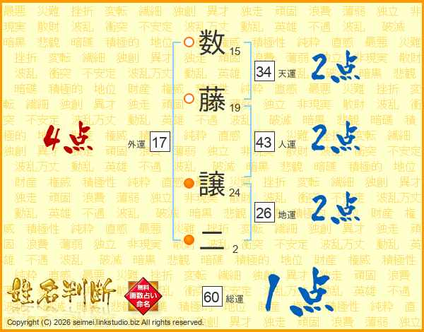 生活面を象徴する運勢です。外部から受ける影響力を表し、結婚運、家庭運や職場、環境への順応性を表します。総運から人運を引いた画数。姓や名が1文字の場合を除く。