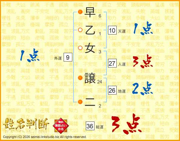 早乙女譲二さんの総運は36画の3点!