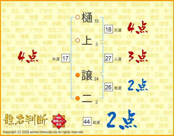 生活面を象徴する運勢です。外部から受ける影響力を表し、結婚運、家庭運や職場、環境への順応性を表します。総運から人運を引いた画数。姓や名が1文字の場合を除く。