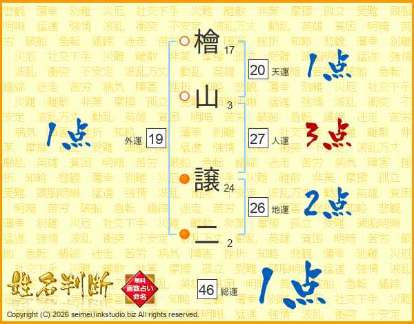 生活面を象徴する運勢です。外部から受ける影響力を表し、結婚運、家庭運や職場、環境への順応性を表します。総運から人運を引いた画数。姓や名が1文字の場合を除く。