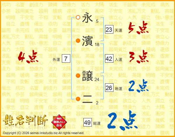 画数の奇数(○陽)と偶数(●陰)の配列で吉凶を占います。どちらかにかたよる名前は大凶名で避ける必要があります。画数の奇数偶数。