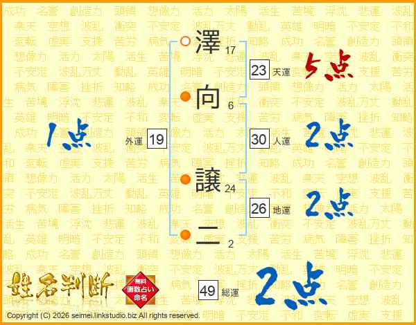 生活面を象徴する運勢です。外部から受ける影響力を表し、結婚運、家庭運や職場、環境への順応性を表します。総運から人運を引いた画数。姓や名が1文字の場合を除く。