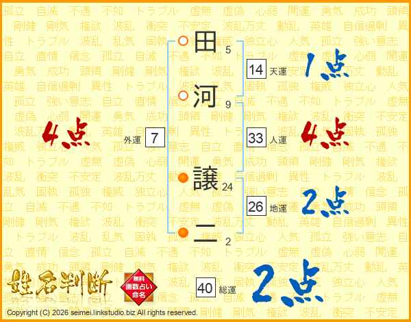 生活面を象徴する運勢です。外部から受ける影響力を表し、結婚運、家庭運や職場、環境への順応性を表します。総運から人運を引いた画数。姓や名が1文字の場合を除く。