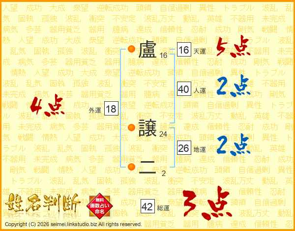 生活面を象徴する運勢です。外部から受ける影響力を表し、結婚運、家庭運や職場、環境への順応性を表します。総運から人運を引いた画数。姓や名が1文字の場合を除く。